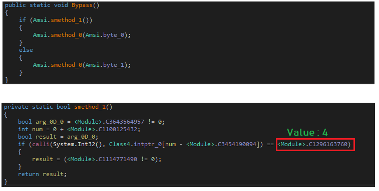 The AMSI bypassing module checks the loaded original amsi.dll for 32bit or 64bit environment, by using API System.Int32(). If the API call returns “4” then loaded amsi.dll is considered as 32bit, otherwise it is considered as 64bit:
