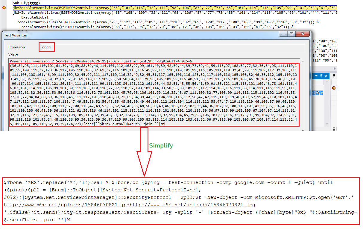 The VBScript executes a PowerShell script using the Fly function. The PowerShell script reads the content from the Unified Resource Locator (URL) "http://www.m9c.net/uploads/15846070821.jpghttp://www.m9c.net/uploads/15846070821.jpg" which is invalid due to the human error of pasting the URL twice by malware author. After correcting the URL to "http://www.m9c.net/uploads/15846070821.jpg" , the malware is able to read the malicious content which is converted into second layer PowerShell script by removing "-" which is then executed: