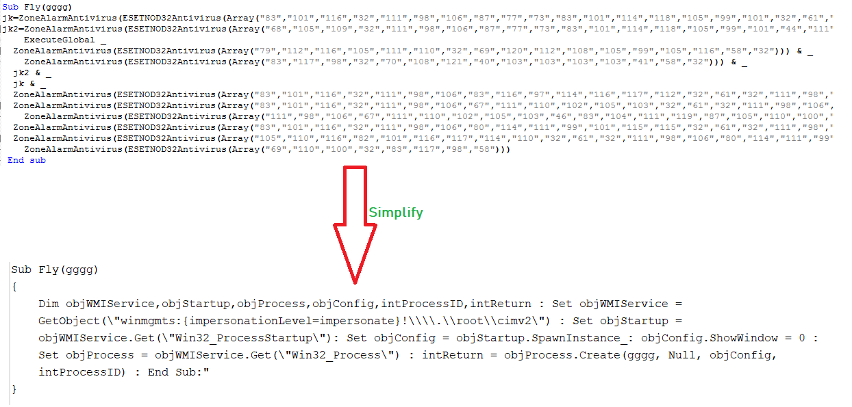 The VBScript has code to check 32bit and 64bit system architecture, but the code execution is same regardless of the system architecture. The malware calls the function AVGAntiVirus which executes winlogon.exe multiple times and calls the function Fly. This Fly function is responsible to spawn a process for the given argument: