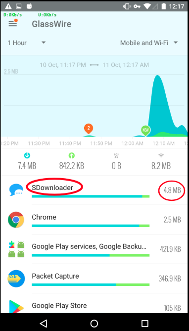 On average we saw data consumption of close to 5MB post infection (as shown in the image below). This does not bode well for users who have limited/capped data plans on their devices as additional data consumption leads to extra charges on the mobile phone bill.