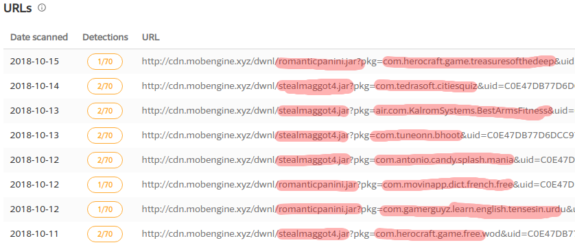 VirusTotal URL scan of one of the domains - cdn.mobengine.xyz - revealed another jar file that is hosted on this domain along with romanticpanini - stealmaggot4.jar: