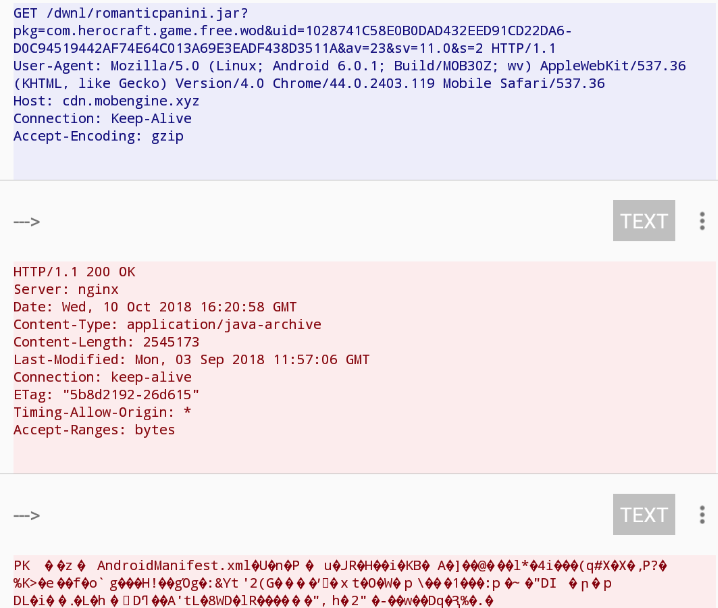 After a few minutes of execution the adware initiates a GET request for a jar file named romanticpanini :