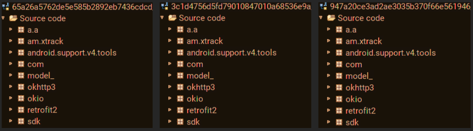 Below is a comparison of code structure from 3 different samples with different app and package names belonging to the Panini Adware campaign: