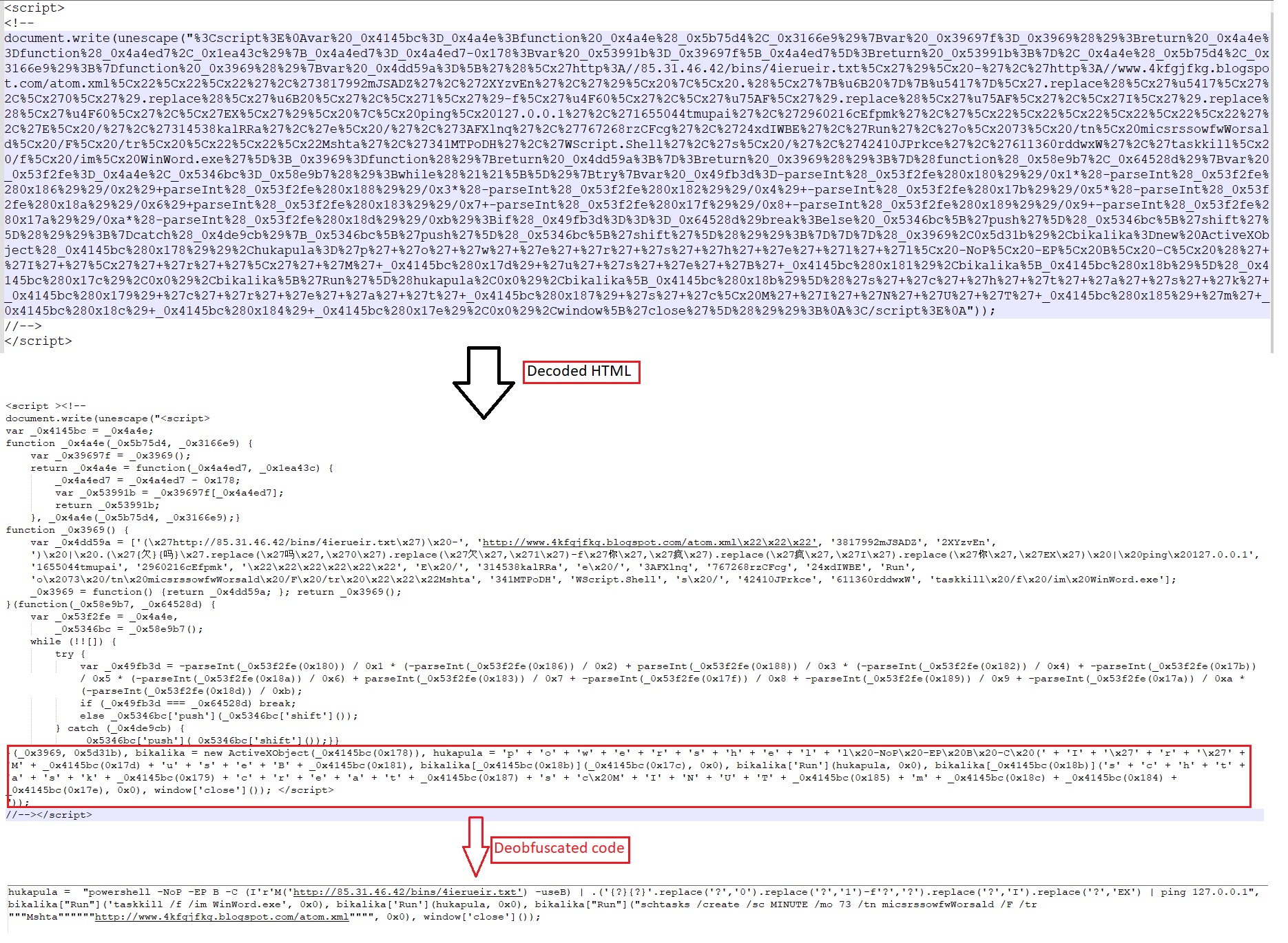 The HTML file contains an obfuscated JavaScript, which tries to kill “WinWord.exe” process and creates a scheduled task as ‘micsrssowfwWorsald’ which opens “http[:]//www[.]4kfgjfkg[.]blogspot[.]com/atom.xml” using Mshta. It also loads a remote hosted PowerShell script using IRM(Invoke-RestMethod) and runs its using IEX(Invoke-Expression).