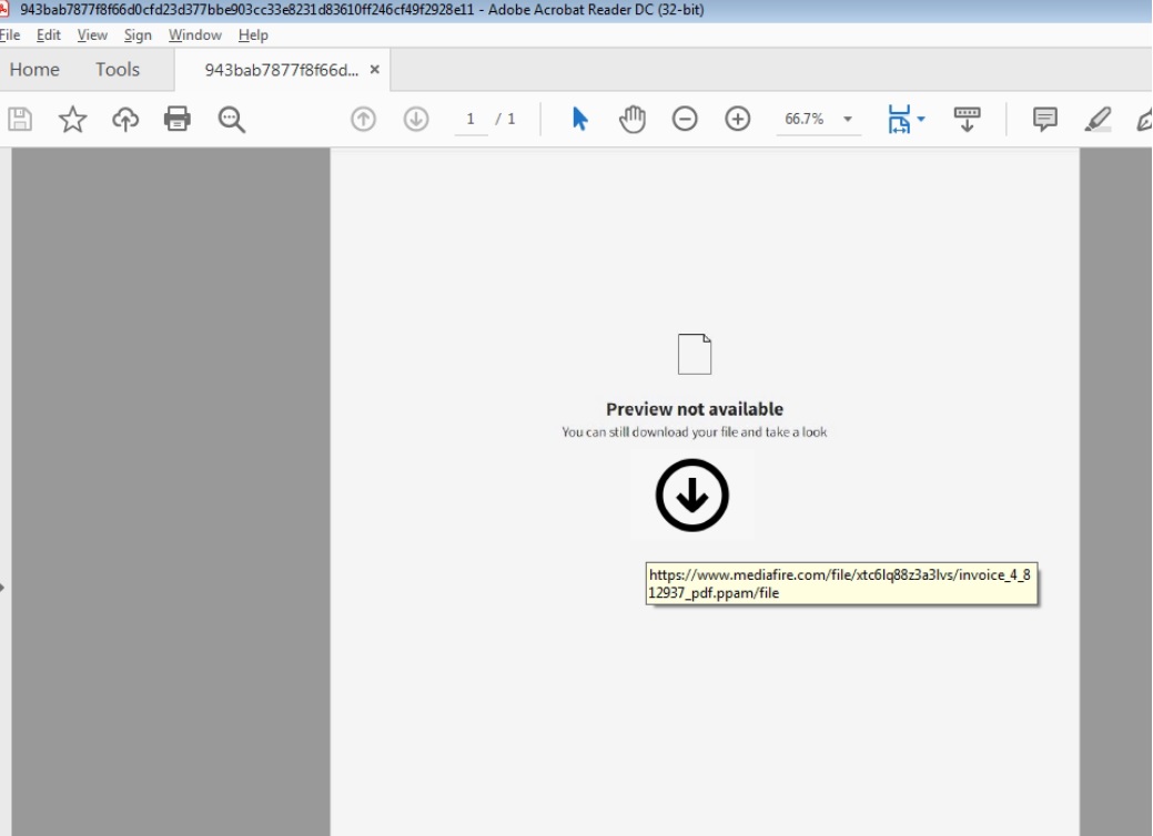 The PDF file contains a link to download the PPAM(PowerPoint File Add-in with macro) which is posted on "Mediafire file hosting service". The PPAM file is downloaded with a genuine looking name as "invoice_4_812937_pdf.ppam".
