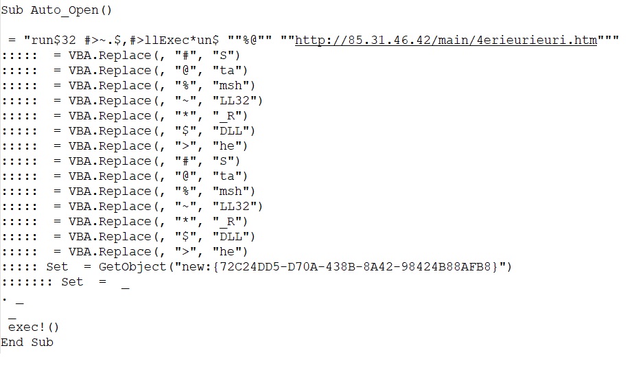 The PowerPoint file has an embedded macro, The macro has an "Auto_Open" function which creates an instance of WScript.Shell object using CLSID {72C24DD5-D70A-438B-8A42-98424B88AFB8}. And using this Shell Object Mshta is executed to run the remote HTML file.