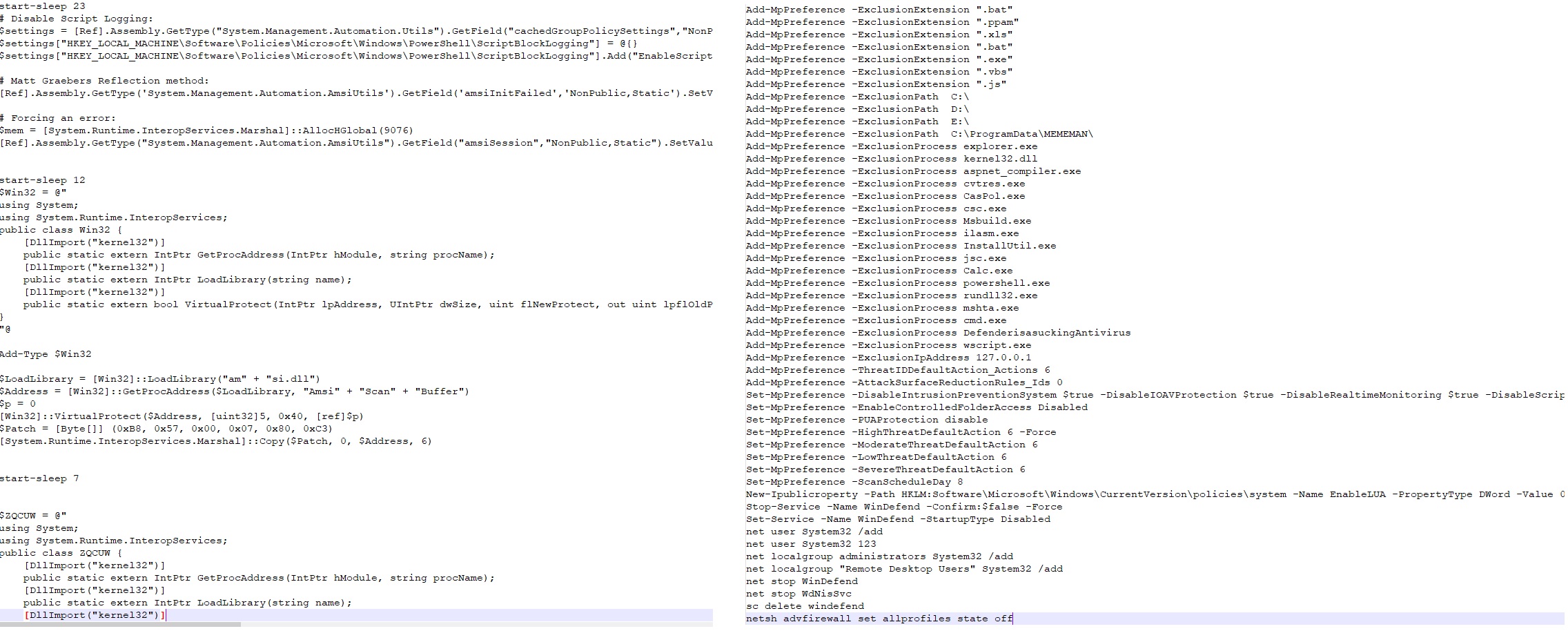 This PowerShell script then runs two more PowerShell commands present is variables $OASI4 and $DEF. Which tries to bypass AMSI, disables script logging, disables AVProtection, add exclusions etc.