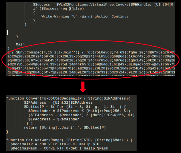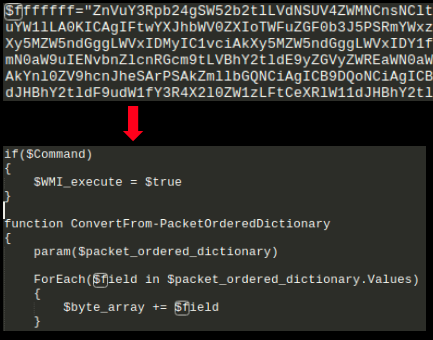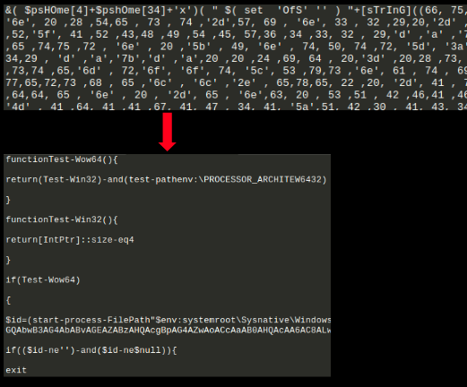 Following image shows the obfuscated PowerShell script and the code obtained after de-obfuscation: