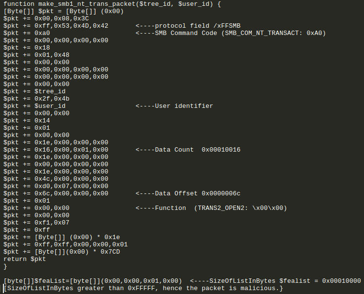 5. The function eb7($target ,$shellcode) contains a number of suspicious components that exploit the vulnerability CVE-2017-0144 which is the infamous Eternal Blue Exploit: