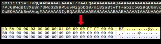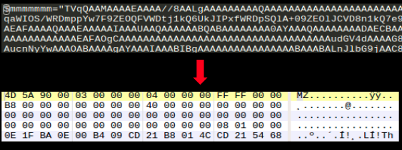 4. $fffffff contains Base64 encoded code to reflectively load mimikatz in memory without writing the binary to the disk thereby adding to its stealthy nature: