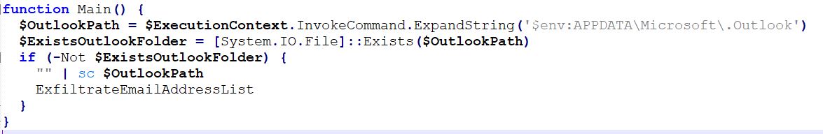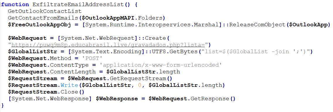 The PowerShell script is responsible for stealing and sending Outlook contacts email addresses to the remote machine.