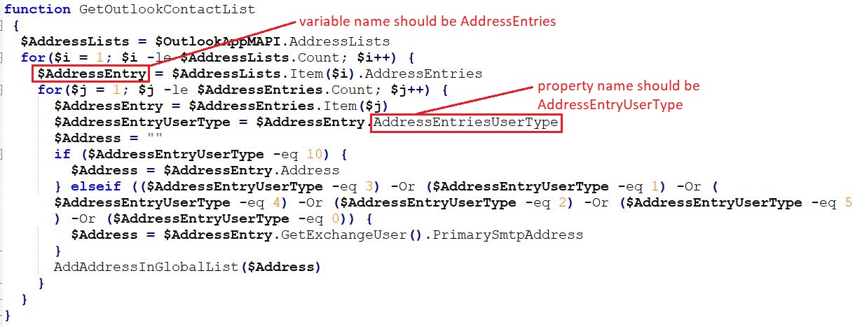 The PowerShell script enumerates outlook contacts and retrieves their email addresses to add them in a global list. However the code won't work as it needed correction in the variable name and a property field as highlighted in the below snippet: