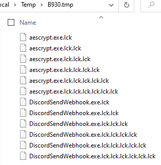 This ransomware appends .lck to all encrypted files. It even manages to encrypt its own aescrypt.exe and DiscordWebhook.exe.