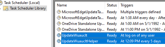 Next, it adds two scheduled tasks to ensure that one instance of malware runs every time a user logs on and another every 5 days.