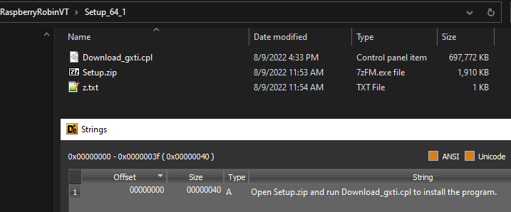 Raspberry Robin is known to spread via infected USB devices, utilizing the 'AutoRun' feature on plugin. The malware will run via a .LNK file on the USB drive that executes 'MSIExec.exe' to download a first-stage payload. Once the system is found to be a valid target, the second-stage payload drops and connects to a Tor address. Initial analysis of the dropper program shows that it begins as a small .zip file (950kb-1250kb) which unpacks another .zip file of roughly the same size. This second archive unpacks into a ~700MB setup file with a .cpl (Control Panel Item) extension, and a text file with instructions to run the installation (Figure 1). Successful execution creates persistence with a RunOnce Key in the registry (HKEY_CURRENT_USER/ and the next stage is downloaded.