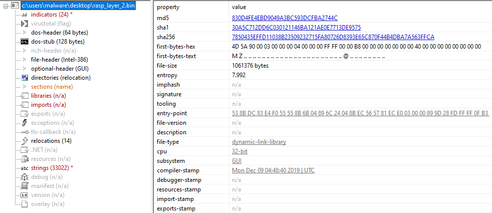 Figure 3: PeStudio results of the secondary layer showing no libraries, imports, exports