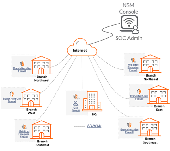 The admin wants to — from one place — centrally deploy, provision and manage SD-WAN networks and application routing services across all sites. The goal in a case like this is to ensure business-critical applications never slow down or shut off and that they continually operate at peak performance. The NSM 2.3 SD-WAN Orchestration feature enables the enterprise SOC to do all that.