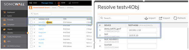 In this scenario, "test" is assigned an IP address of 10.5.5.10, while "demo_tz670_gen7" is given the value 10.101.1.10. Template Variables preserve the uniqueness of the device-specific value during the commit and deploy process.