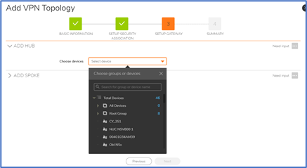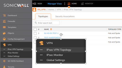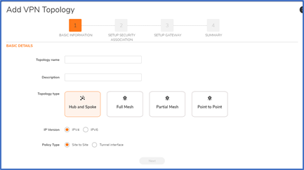 The NSM 2.3 VPN Orchestration feature helps admins establish site-to-site connectivity and communication quickly and without errors by using a repeatable, self-guided workflow. This feature enables them to centrally configure VPN settings and policies using a wizard-based, step-by-step setup process.