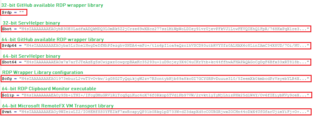 The malware now checks for "TermService" (Remote Desktop Service), if not already present, the malware creates the service setting "ServiceDll" path as "%SystemRoot%\System32\termsrv.dll" and then terminates "TermService" if already running. The malware contains strings variable, which are Base64 decoded, followed by gzip decompression to get the component files(32-bit ServHelper binary, modified 64-bit RDP Wrapper Library, 64-bit ServHelper binary, RDP Wrapper Library configuration, 64-bit RDP Clipboard Monitor executable and 64-bit Microsoft RemoteFX VM Transport library):