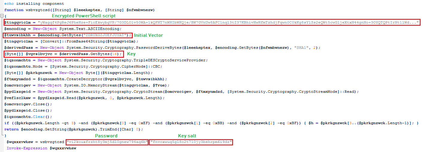 This PowerShell script perform Base64 decoding, followed by the decryption using Triple Data Encryption Standard (TripleDES) algorithm to get second level PowerShell script. The second level PowerShell script is executed after removing null bytes from the end:
