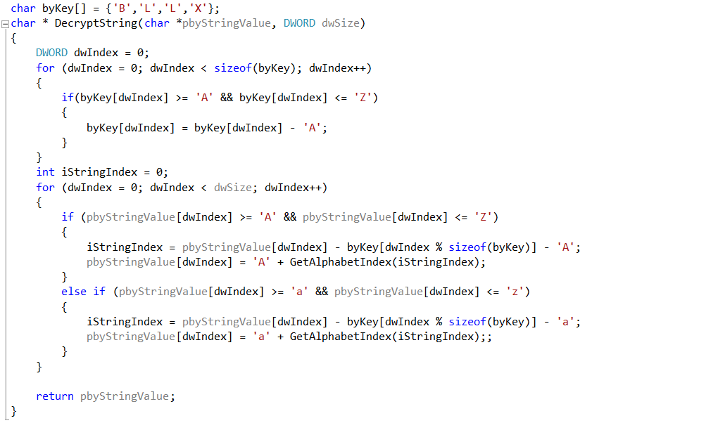 The malware decrypts encrypted string "d:\xbl_QpfneNpYlu_.qye" to "c:\aaa_TouchMeNot_.txt" using below decryption logic and uses same decryption logic for decrypting other encrypted strings:
