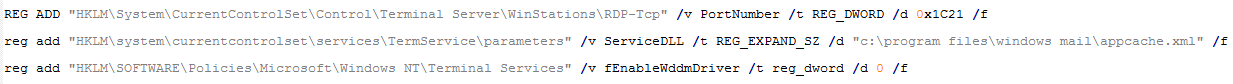 The malware changes Remote Desktop Protocol (RDP) port to "7201" and ServiceDLL to "$env:programfiles\windows mail\appcache.xml" for "Remote Desktop Service". The malware then starts "rdpdr" and "TermService" services. ServiceDLL for "TermService" which is now "Modified RDP Wrapper Library" executes the ServHelper binary.