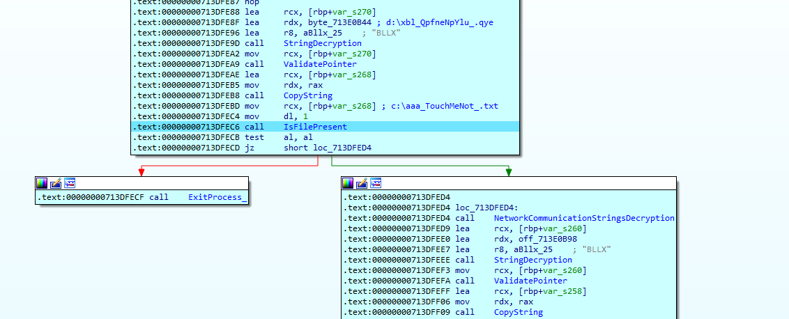 The malware now checks the presence of "c:\aaa_TouchMeNot_.txt" (Windows Defender's goat file), if found then malware terminates the execution: