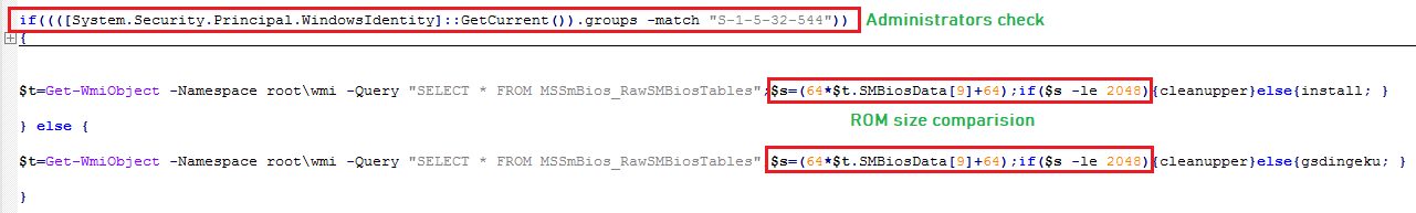 The PowerShell script checks the Read Only Memory (ROM) size, by accessing "SMBiosData" property in System Management BIOS (SMBIOS). If ROM size if less than or equal to 2048 KiloBytes, the malware calls function "clearupper" which removes the temporary files and terminates the execution. The 9th byte is "SMBiosData" represents "". Checking ROM size can be a used to determining virtual environment or the malware author does not want to execute ServHelper, if victim's machine does not meet the expected ROM size. If the malware is executed with "Administrators" account then "install" function is executed which is responsible for further ServHelper execution, else "gsdingeku" is executed which is responsible for executing the PowerShell script with escalated privilege: