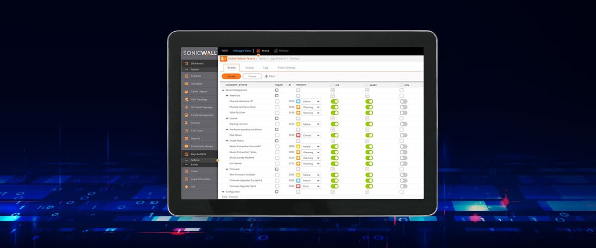 SonicWall’s Network Security Manager (NSM) allows admins to enable and disable alerts at a central location for all firewalls within a tenant. Admins can pick and choose events for which they want to receive alerts — enabling alerts that are of importance to them and disabling the rest.