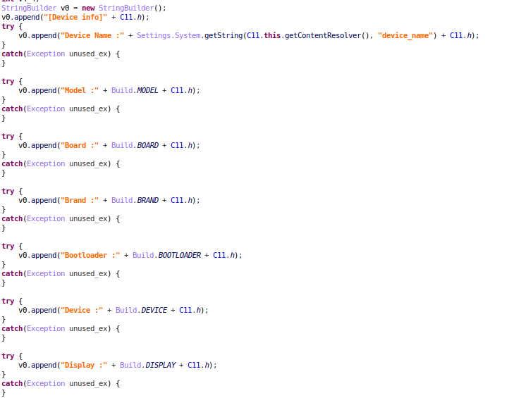 • It captures details about the device which can be used by the perpetrators to identify the victim and gather additional details. Following was identified: