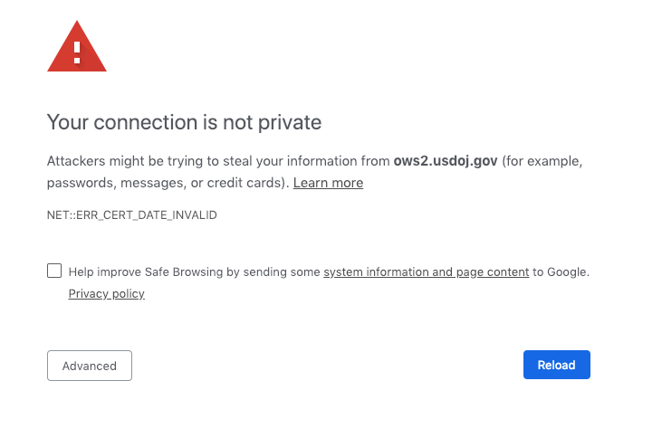 Message shown by the Chrome browser on a subdomain for a U.S. government site with an expired certificate.