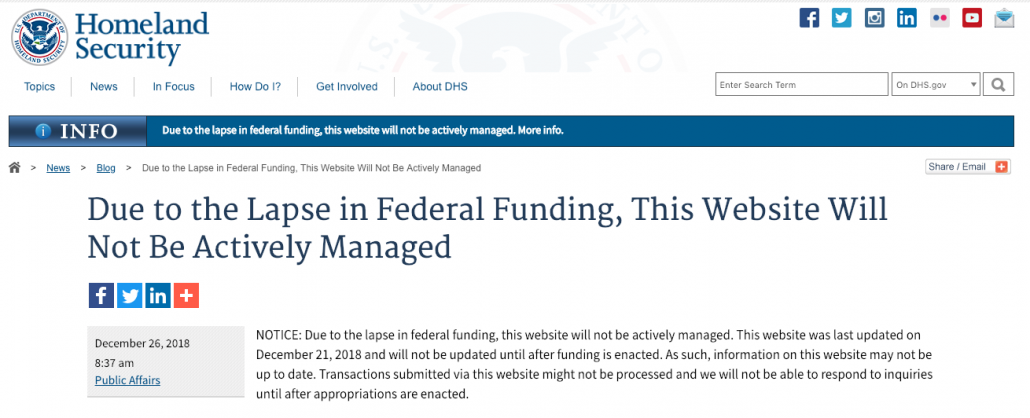 A note on the U.S. Department of Homeland Security alerts visitors to lack of funding and management.