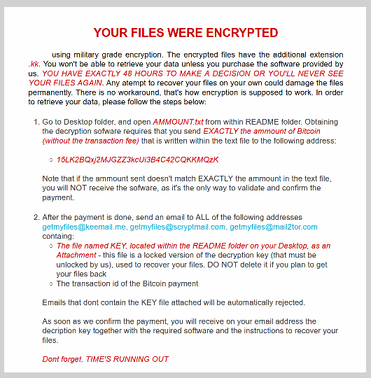 Meanwhile the ransomware encrypts the victim's file like usual and appends .KK to all encrypted files. The ransomware note with details on payment instructions is then displayed as shown in the figure below: