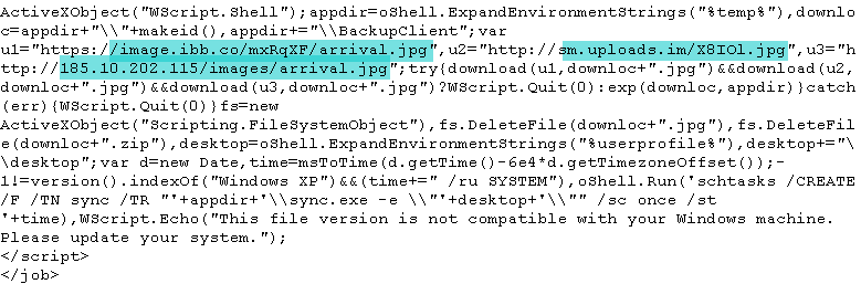 Upon execution, it downloads a jpg file as seen in the snippet of the javascript code below: