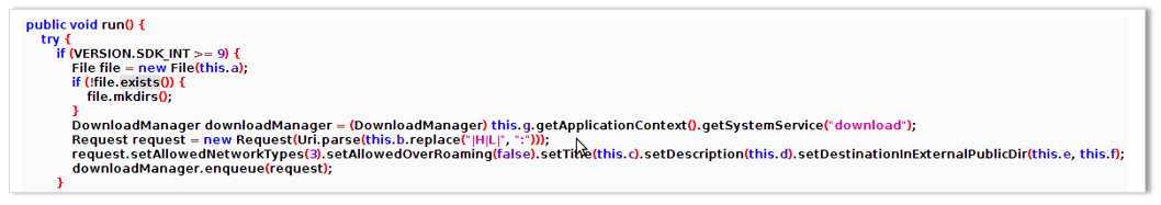 Spying on the user is not the only only objective of this app, it makes the device vulnerable to further attacks. One of the commands is to initiate a download using a URL, this can be used to download additional malicious apps and further infect the device or use the device as a conduit for spreading other malicious campaigns