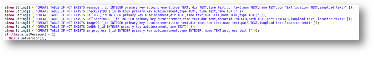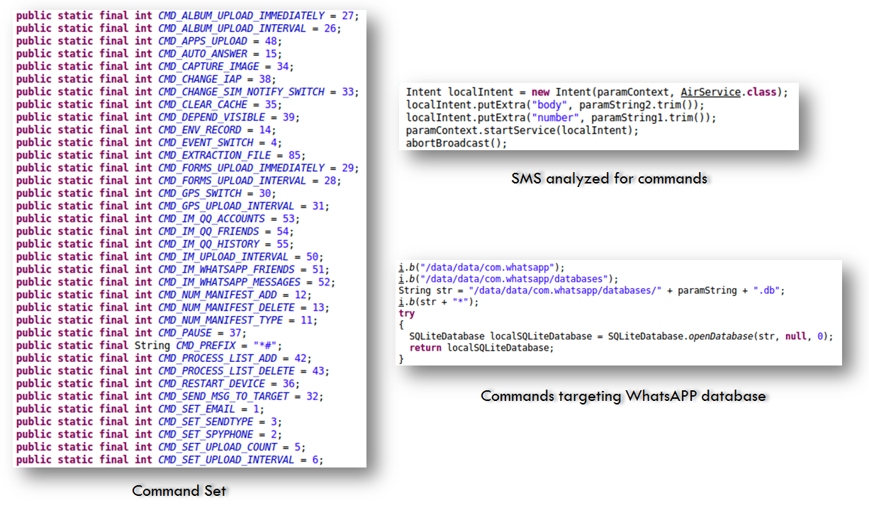 Service is an Android app component that runs in the background to carry out long term tasks. Even if an app is not active on-screen, its services can be constantly running in the background. After BootReceiver ensures that the database is created successfully it starts a service called GodService which starts another service called TeamService. TeamService keeps an eye on incoming SMS messages and scans them for commands coming from the server. The commands are present in the AirService class, this Trojan has a roster of over 40 commands. Some interesting commands are as follows:
