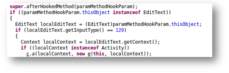 Additionally the Trojan places hooks and constantly checks if InputType value for EditText operation for an app is 129. Value 129 has been set by Android to correspond to Password textbox, it saves details about the app for which this information belongs. Using this component the malicious module can spy on passwords entered by a user on his infected device.