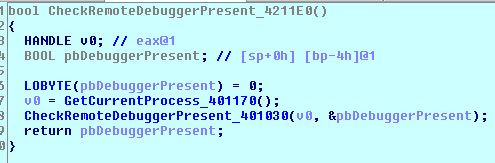 CheckRemoteDebuggerPresent() is a kernel32.dll function that sets (-1)0xffffffff in the DebuggerPresent parameter if a debugger is present. Internally, it also uses NtQueryInformationProcess() with ProcessDebugPort as a ProcessInformationClass parameter.
