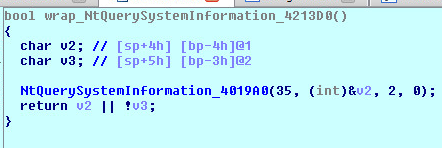 NtQuerySystemInformation() function call of the ntdll.dll can be used with the undocumented SystemKernelDebuggerInformation as a SystemInformationClass parameter to detect the presence of a debugger. The result is stored in the buffer pointed by the SystemInformation parameter that has 2 bytes representing two flags. Each one with 8 bits (LSB KdDebuggerEnabled and MSB KdDebuggerNotPresent). KdDebuggerNotPresent is FALSE if a debugger is present.