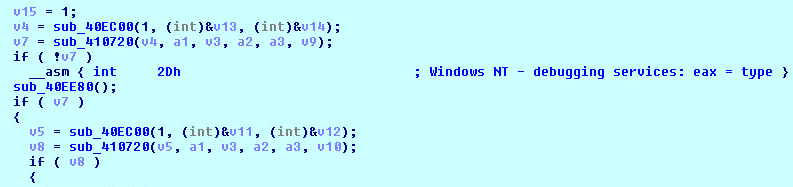asm { int 2dh }, is the interface for the Win32 kernel and provides kernel debugging services to user level debuggers and remote debuggers such as IMM, Kd and WinDbg.