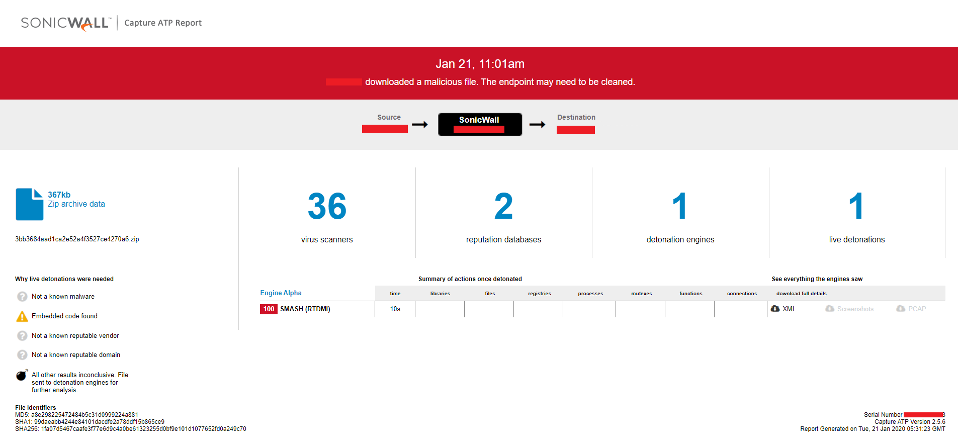 For last two weeks, SonicWall RTDMI ™ engine is detecting archive files which are delivered to the victim's machine as an email attachment. The archive file contains a VBScript file which executes DanaBot malware as final payload. The malware was first detected on January 21, 2020 by SonicWall RTDMI ™ engine and since then continuously monitored by SonicWall threat research team.