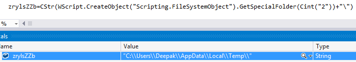 The malware gets the %TEMP% folder path by calling GetSpecialFolder method with folderspec argument as "2". The malware ensures its execution must happen only once on the victim's machine, by checking the presence of file "%TEMP%\gnikGGjID". If the file is already present on victim's machine, the malware terminates its execution, else it creates the file and writes text "uhhHQOBx" into it: