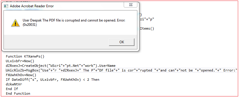 On execution, the VBScipt file saves the current time into a variable, then displays an error message "User <username> The PDF file is corrupted and cannot be opened. Error: (0x20031)" with caption "Adobe Acrobat Reader Error". The file is not actually corrupt, rather this message was intentionally displayed by malware to mislead the user. Once the user clicks on the "ok" button, the malware again gets the current time and compares it with the time which was saved before showing the error message. If the time difference is less than two seconds, the malware executes a method named "dzkwNtVr". However this method does not contain any code, but our hypothesis says, this can be used to terminate the execution with a suspicion of controlled environment execution: