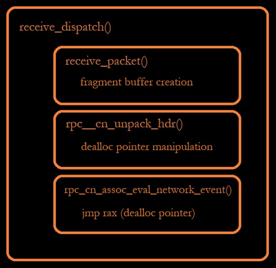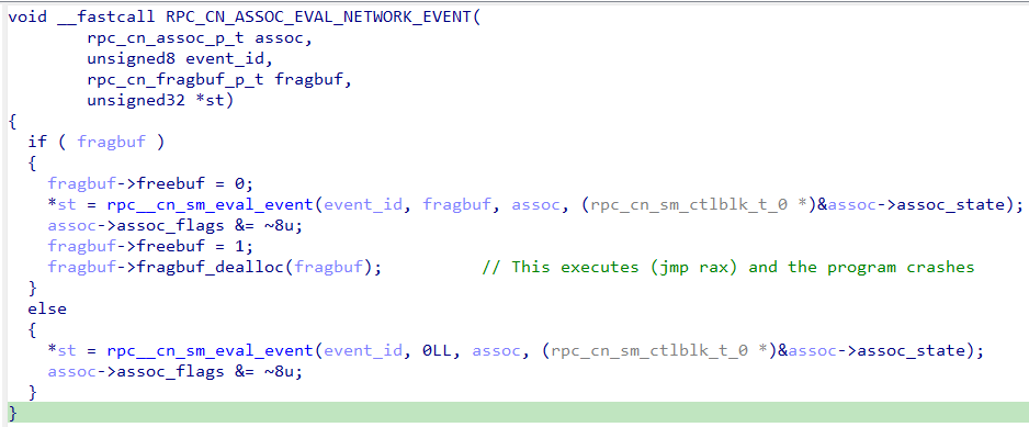 Once inside the rpc_cn_assoc_eval_network_event function, an attempt is made to deallocate the fragment buffer. However due to an invalid function pointer, the application will crash at the call to “fragbuf_dealloc(fragbuf),” suggesting the pointer has been manipulated from the above swap of the base address.