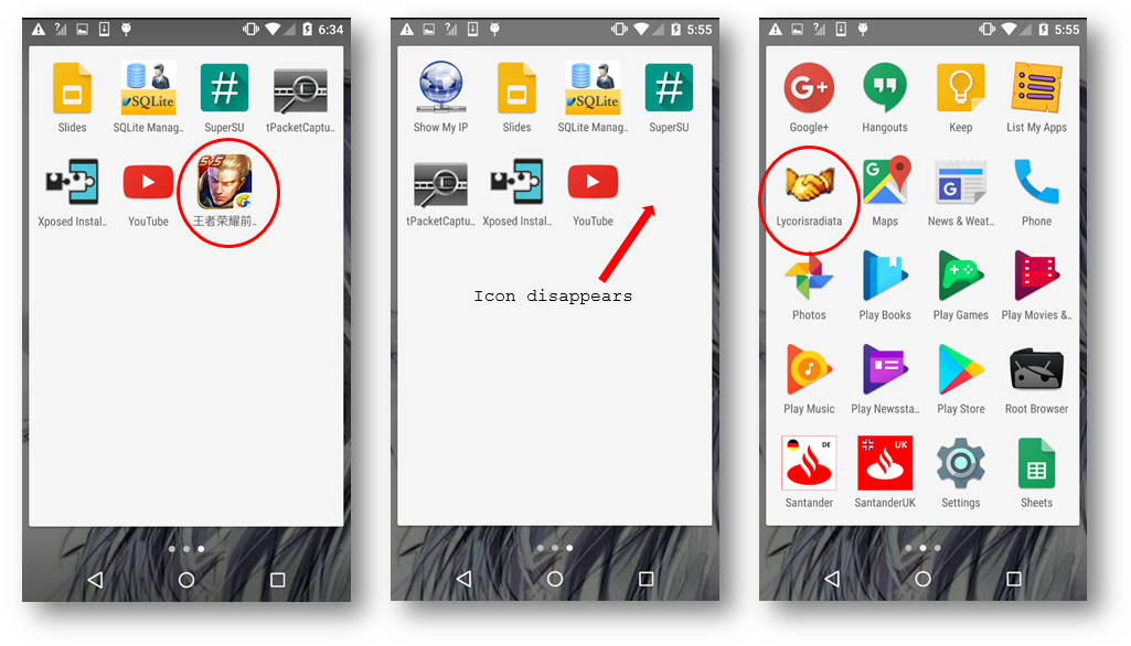 Upon installation the app disappears from the app drawer, but a new icon is visible with the name lycorisradiata - which is the name of a plant red spider lilly. This however is not a new app, it's the same malicious app with a different app icon.