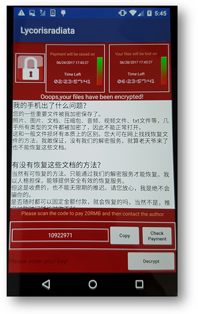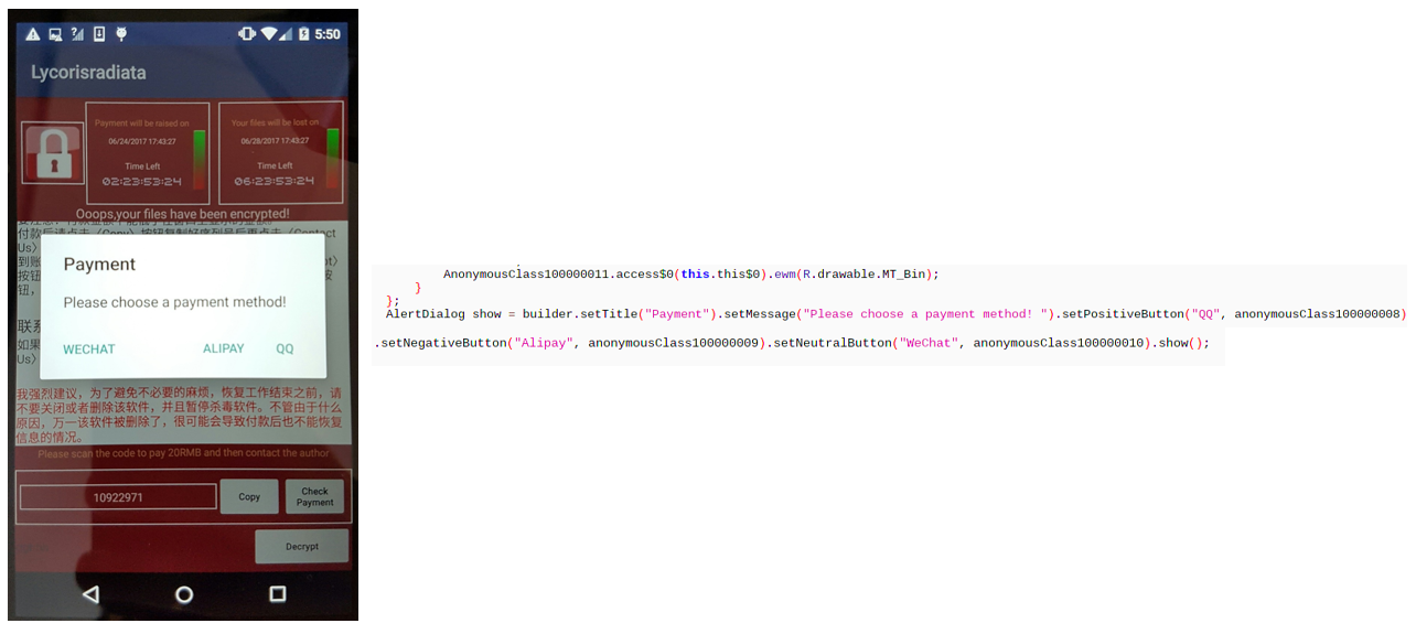 As a ransom the apps in this campaign ask for either 20 or 40 RMB (1RMB approx 0.15 dollars). It accepts the following payment methods: