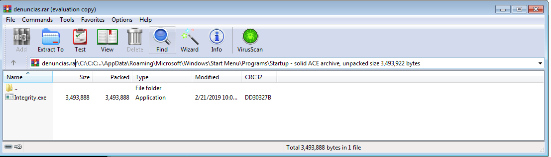 Thus by extracting the malicious archive on vulnerable hosts, the script plants the malware program "integrity.exe" on the startup directory as shown below