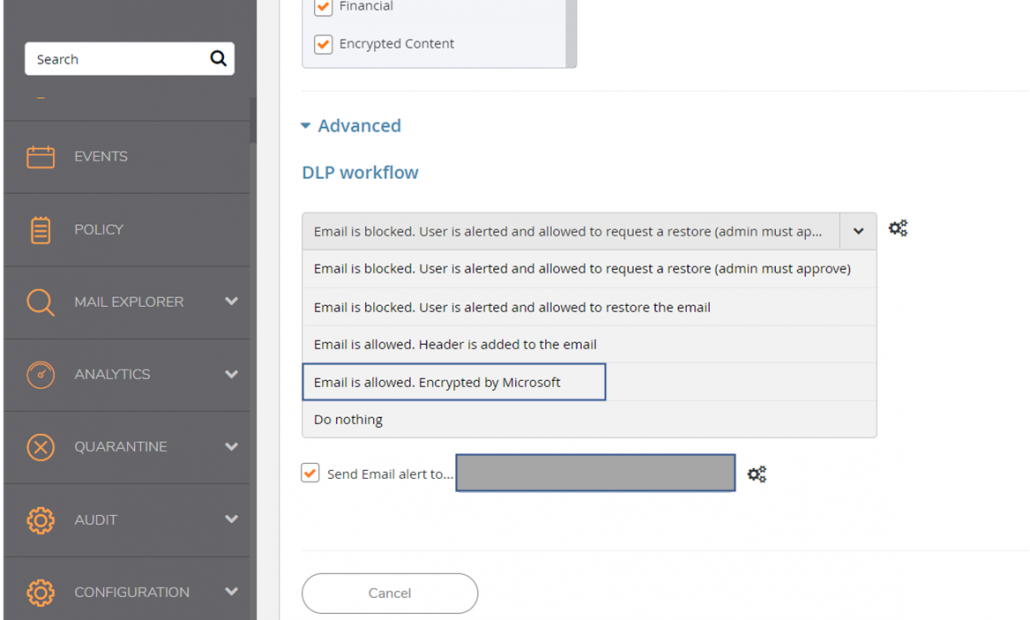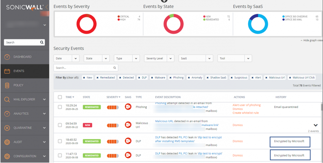 Once you’ve enabled the DLP workflow, outgoing emails that have been encrypted by the policy can be easily located under the Events pane. Selecting the event itself allows you to drill down into the Security Event details with the History visibly stating, “Encrypted by Microsoft.” There are various filters available to examine the available events more closely in case suspicious activity needs to be investigated.